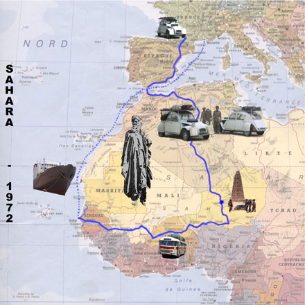 Détail du parcours: Algéciras Ceuta, le Riff, Ketama, Al Hoceima, Oran, Laghouat, Gardhai, El Goléa, In Salah, In Ekker, Tamanrasset, In Guezzam, Assamaka, Arlit, Agadez. (Vente des 2CV à Agadez) Agadez, Zinder, Maradi, Niamey en camion. Niamey, Ouagadougou en Car Chausson. Ouagadougou, Bobo Diolasso en train. Bobo, Bamako en taxi de brousse. Bamako, Tambacounda, Dakar en train. Dakar, Martigues en cargo. |