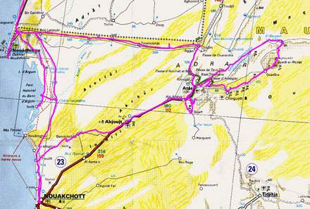 | Traversée de Sète à Tanger et descente du Maroc et de l'ex Sahara Occidental en longeant la côte atlantique. Etape à Nouadhibou , puis Nouakchott par la nouvelle route en construction. Remontée par la plage à marée basse jusqu'au village de Tilouit, puis cap Nord Est sur Bennichab , et de Akjout à Adrar sur route. Ballades prés de Tergit et merveilleuse hospitalité de Mohammed Salem , découverte du campement de Todes, rencontre avec Abderrahmane et Naba, circuit sur le plateau avec une belle descente sur l'oasis de Maihret. Remontée de l'oued Abiod de Oudjeft à Terjit en passant par Tounghât . Retour à Atar puis départ sur Chinguetti par la fameuse passe d'Amodjar, visite de fort Saganne. |
