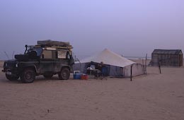 Notre projet est de louer une lanche (une barque avec voile) pour explorer des îles refuges de regroupements d’oiseaux, à marée haute. On nous apprend que la réservation d’une lanche doit être faite directement au village de pécheurs d’Iouik, et que nous sommes obligés de passer la nuit dans un campement du parc, à Ten Alloul prés d’Iouik. La nuit va bientôt tomber, nous devons faire vite pour rallier Iouik qui est 30 km plus au sud. Dés le départ on se plante dans une zone humide, angoisse ! Le land sort tout seul en courte. On redoute ces plantages humides et aspirants, car nous avons déjà eu plusieurs expériences de ce type. |