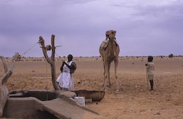 On a déjà fait 40 km, c’est tout bon, et on pique vers l’Est pour reprendre la piste de Nouakchott, et retrouver l’embranchement vers Bennichâb. Au loin à gauche, des dunes que l’on longe de loin pendant quelque temps. On navigue au nord-est, il fait lourd et couvert, le paysage est très proche du reg. On ne croise que des chameaux, pas un véhicule, pas âme qui vive. Arrivée au puit de Boû Guetra noté eau salé sur la carte IGN. Un chameau tire de l’eau du puit, guidé par un petit garçon sous les ordres de son père, le chamelier. Une grosse outre déverse au moins 50 litres à chaque rotation, pour abreuver un troupeau d’au moins 30 têtes. Après le puit on contourne quelques dunes, puis arrivée sur Bennichab. Mais à part un cimetière, on ne voit rien qui ressemble à une usine d’embouteillage d’eau de source telle que notée dans le guide. Il faudrait rayonner alentour, mais rien à l’horizon. Plus loin, pause déjeuner (taboulé fait maison). Passe un homme, comme un mirage, qui poursuit son chemin |