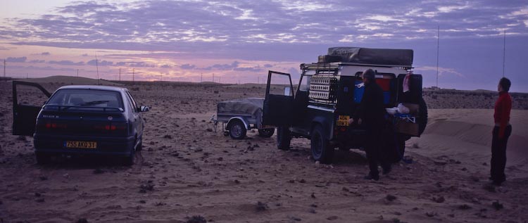 Départ vers 18h avec un passage de police sans problème. Bifurcation à droite vers El Argoub . Le soleil décline au couchant, lune pleine se levant au N.E. et vol d’oiseaux (grues ?) sur le ciel au-dessus de la mer. Vision sublime ! Passage du tropique du cancer à la latitude 23°27’. Nous sommes quasiment au même niveau que Tamanrasset en Algérie. Bivouac après El Argoub , une piste à droite, 500 m et on se love dans le creux d’une grande dune isolée. Bivouac de rêve, l’air est doux. Un pêcheur passe et discute avec nous des conditions de vie par ici. La pêche est réglementée, pas le droit de pêcher avant mai, les droits de pêche sont vendus au Mexique, et au Chili, destituant ainsi les pêcheurs marocains. Il vient de Rabat où il n’est pas retourné depuis 3 ans pour voir femme et enfants, par manque d’argent. |